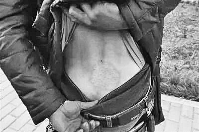 杜強(qiáng)掀起外衣,背上露出被煤球烤的印跡。(圖片為當(dāng)事人提供)