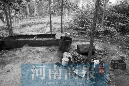 8月27日上午,二七區(qū)侯寨鄉(xiāng)青年農(nóng)場東300米(紫玉路南)的一片樹林中污水橫流??盏貎?nèi)擺放著近20個大油桶,幾個大鍋內(nèi)還有提煉地溝油后剩余的渣。