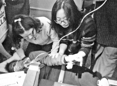 隨后,兩名女孩跪在地上,一個(gè)為女子把脈,一個(gè)為她戴上氧氣面罩。其中一名女孩說,可能是低血壓引起的心臟病,且心跳十分微弱,需要趕緊輸液。