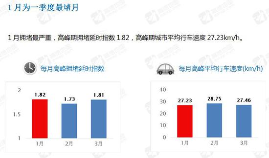 第一季度中,1月為一季度最堵月,鄭州市一季度有1天的出行時(shí)間是暢通下的2倍以上。