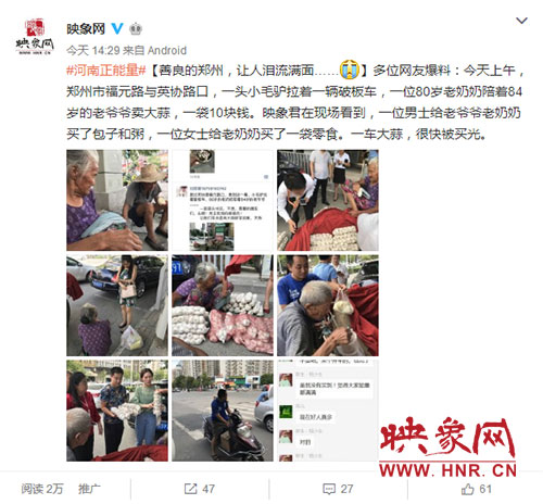 映象網(wǎng)快訊(記者 王寬 趙輝 實(shí)習(xí)生 張璨榮 文/圖)“我能想到最浪漫的事,就是和你一起慢慢變老……”8月23日中午,鄭州街頭上演暖心一幕,年過(guò)八旬的中牟老農(nóng)趕著毛驢車(chē)?yán)习檫M(jìn)城賣(mài)大蒜,一車(chē)蒜被搶購(gòu)一空,卻裝滿(mǎn)了鄭州愛(ài)心市民送的食物。