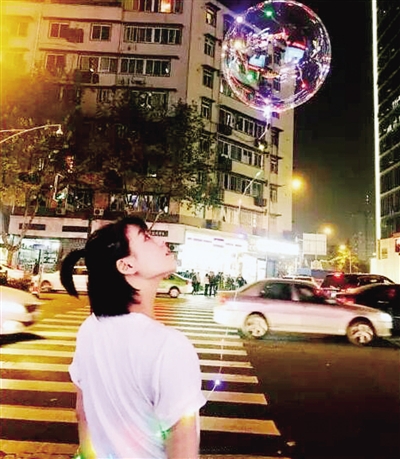 “發(fā)光氣球”構(gòu)造簡單,充有氦氣的透明氣球表面有一圈LED燈帶,燈帶末尾連著一個裝有三節(jié)電池的電池盒,電源直接與燈帶相連,可以隨時控制燈帶的開關(guān)。氣球可維持三四天,電量可用10余天,補(bǔ)充一次氦氣需10元。