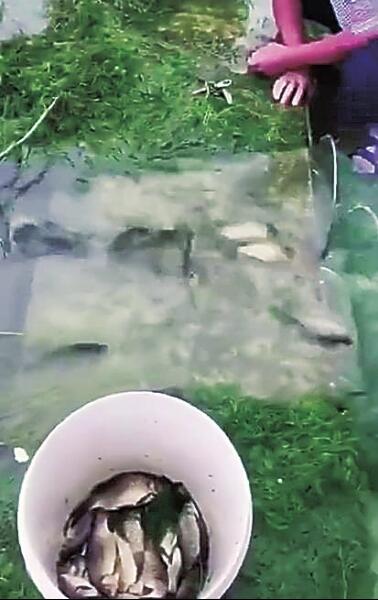 本次強(qiáng)降雨還導(dǎo)致固始縣境內(nèi)的多條河流水位暴漲,河邊地勢較低的農(nóng)田被淹沒。在固始縣城郊,一口水塘因?yàn)樗槐q,水從塘埂一處低洼處溢出,水塘內(nèi)大量鯽魚紛紛隨著水流準(zhǔn)備出逃。村民發(fā)現(xiàn)后,在水流下方用網(wǎng)攔住魚兒去路,不一會兒就收獲一水桶鯽魚。