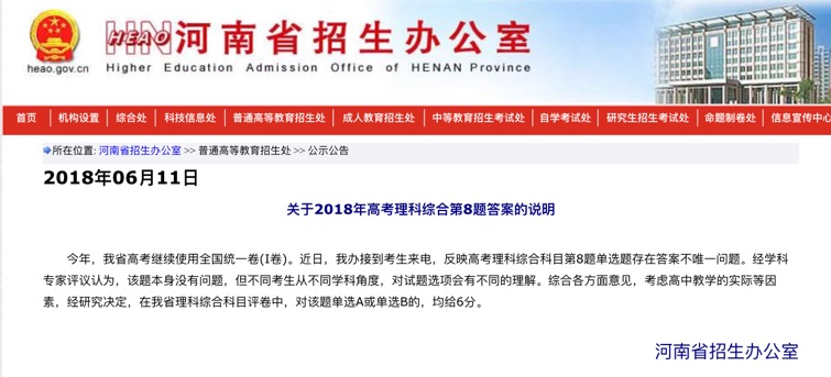 近日,河南省招生辦公室接到考生來電,反映高考理科綜合科目第8題單選題存在答案不唯一問題。經(jīng)學(xué)科專家評議認(rèn)為,該題本身沒有問題,但不同考生從不同學(xué)科角度,對試題選項會有不同的理解。