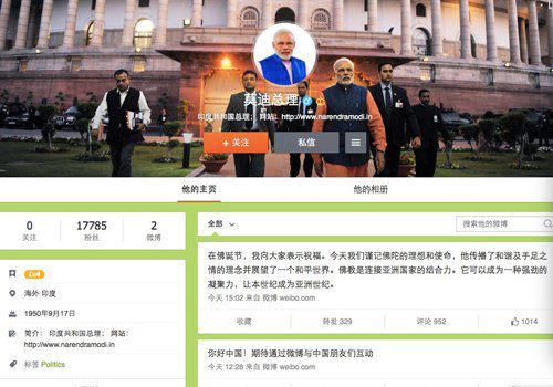 據(jù)新浪微博一位負(fù)責(zé)人介紹,莫迪一直很重視社交媒體平臺(tái),在中國(guó)開(kāi)通微博,是為了加強(qiáng)與中國(guó)網(wǎng)友的溝通。此外,莫迪也是印度第一位在微博開(kāi)通賬號(hào)的高級(jí)官員。