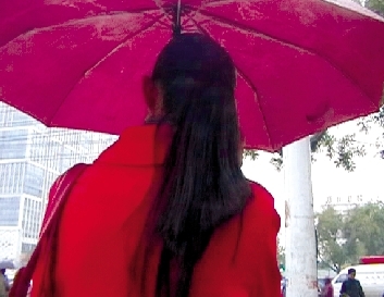 下午2時,航海路與大學路交叉口附近,一襲紅衣的張女士雨中擎?zhèn)阈凶咴谌诵械郎稀?/p>