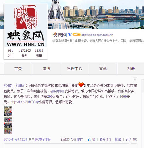 “老漢錢被盜,鄭州市民網(wǎng)友義買粉條”微博發(fā)布于2013年11月19日,當(dāng)天,映象網(wǎng)記者在街頭采訪,偶遇中牟縣的一位農(nóng)家老漢與老伴到鄭州賣粉條,不料騾子被偷,錢也被盜。映象網(wǎng)迅速發(fā)布新聞,并連續(xù)發(fā)布多條微博,呼吁市民網(wǎng)友伸出援手幫助兩位老人,迅速引發(fā)關(guān)注,短時(shí)間內(nèi)轉(zhuǎn)發(fā)量超過200次,閱讀量接近20萬(wàn)次,引發(fā)眾多愛心市民網(wǎng)友前往購(gòu)買粉條,400多斤粉條在兩個(gè)小時(shí)內(nèi)被搶購(gòu)一空,丟失的騾子也成功找回。