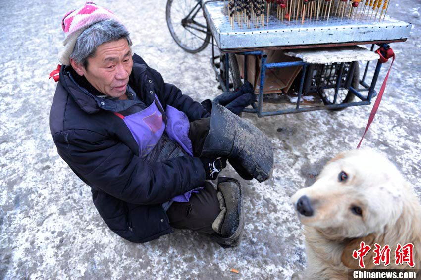2月6日,在長春市一條繁華的街路上,一只小狗幫助身殘主人拉車賣冰糖葫蘆,成為長春冬日街頭一道感人的風(fēng)景線。據(jù)主人介紹,雖然自己身殘且貧窮,但并不想靠別人救濟(jì)度日,因此學(xué)會(huì)了制作冰糖葫蘆的手藝,并以此自食其力。而他養(yǎng)的這條小狗“大黃”也是對(duì)主人不離不棄,每日都會(huì)幫助主人拉車外出謀生。圖為主人在賣冰糖葫蘆時(shí),小狗乖乖的守在車旁。張瑤 攝