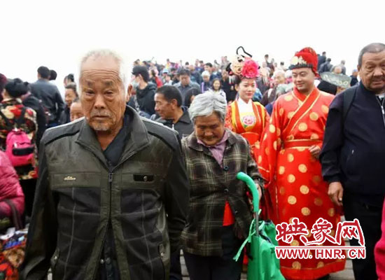 重陽(yáng)節(jié)老人們?cè)谇迕魃虾訄@樂(lè)開(kāi)了顏