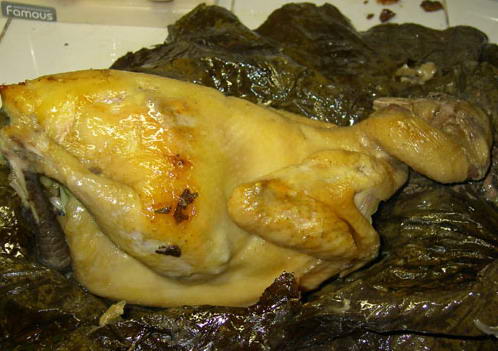 先將雞去腳爪肋下取臟,將腿、翅、頸骨入壇,加醬油、紹酒、精鹽腌漬一小時(shí),取出,將丁香、八角碾末,加山奈遍抹雞身,炒鍋入熟豬油,炸蔥、姜起香后撈去,再將蝦仁,雞肫丁、香菇丁、豬肉、火腿丁、蝦米入炒鍋顛炒幾下,加紹酒、醬油、白糖炒至斷生,待涼后塞入雞腹,放丁香并用豬網(wǎng)油包緊雞身,外用鮮荷葉包裹數(shù)層用細(xì)麻繩扎緊,把酒壇泥碾成粉加清水拌和起粘平攤濕布上,把雞置泥中間用濕布兜起,使泥緊粘揭去濕布,用包裝紙包裹,再戳一小孔,將雞裝入烤箱,旺火烤約40分鐘取出,用濕酒壇泥封孔再烤半小時(shí),用小文火烤80分鐘,再用微火烤90分鐘,取出敲去泥,去強(qiáng),荷葉裝盤,淋芝麻油即成。
