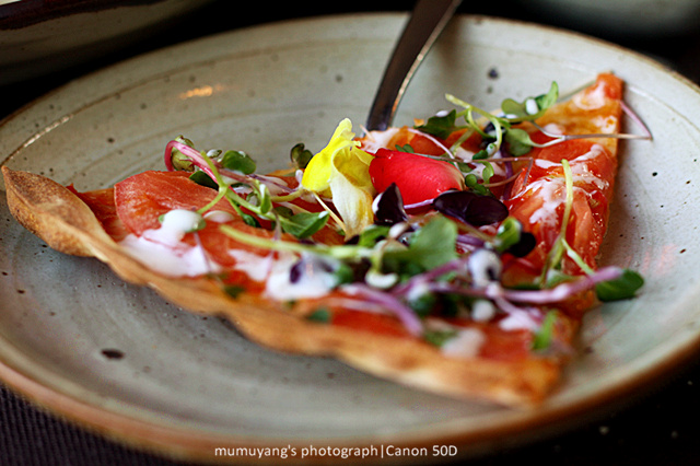 ▼酥酥薄薄的比薩,鋪上蕃茄,嫩芽和花瓣,佐上特有的酸奶醬,味道非常獨特。