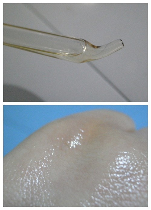 肌膚清潔之后,開(kāi)始使用彼得羅夫維他命A晚間滋養(yǎng)精華液。PTR小藍(lán)瓶是水狀油質(zhì)的透明無(wú)味液體,滴在手背上極易擴(kuò)散,說(shuō)明它的流動(dòng)性很強(qiáng)。稍加按摩,精華液便被完全吸收,滋潤(rùn)但不黏膩,讓肌膚很有好感。