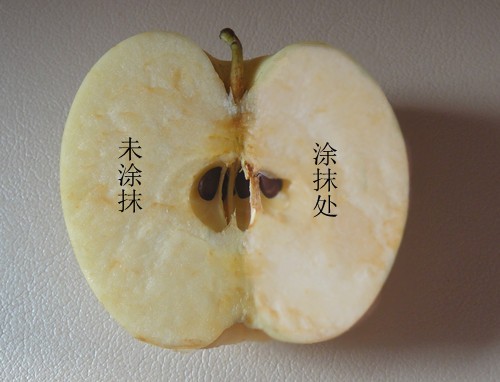 把涂抹了精華液的蘋果放在未見(jiàn)陽(yáng)光的桌上4小時(shí)后,涂抹精華液的右面沒(méi)有氧化變黃,依然水分充足,滋潤(rùn)新鮮,而未涂抹的左面就因?yàn)檠趸兊冒迭S干澀。這就說(shuō)明它的抗氧化性極強(qiáng),對(duì)肌膚有很強(qiáng)的保護(hù)作用。