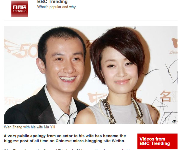 終于,出現(xiàn)在外國媒體報(bào)道中的華人明星名字不再只是鞏俐、章子怡等國際腕兒了。霸占國內(nèi)娛樂圈頭條的“文章出軌事件”,已經(jīng)漂洋過海到了全球各地,出現(xiàn)在多家國外媒體的版面上。包括英國BBC、《每日郵報(bào)》、美國《美聯(lián)社》、《紐約每日新聞報(bào)》、《好萊塢記者報(bào)道》、《娛樂在線》、澳洲《悉尼先驅(qū)晨報(bào)》、加拿大CBC、越南《民智報(bào)》新聞網(wǎng)站(dantri.com.vn)等多家外媒都對此事進(jìn)行了報(bào)道,并集體關(guān)注文章道歉微博所打破的社交媒體轉(zhuǎn)發(fā)記錄。