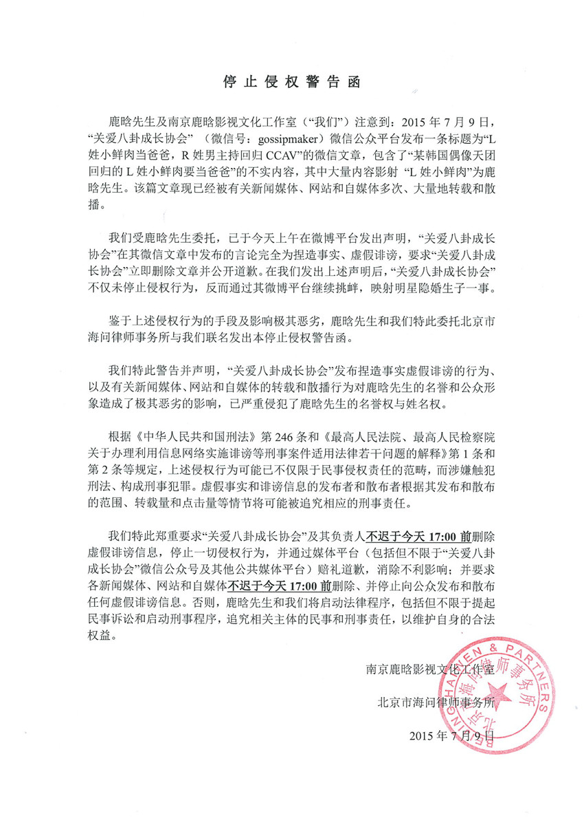 7月9日,關(guān)于“關(guān)愛八卦成長協(xié)會(huì)”微信公眾號發(fā)布“L姓小鮮肉當(dāng)爸爸”一文,影射鹿晗先生一事,鹿晗工作室發(fā)律師函否認(rèn)并警告其造謠生事,稱:“我們受鹿晗先生委托,已于今天上午在微博平臺(tái)發(fā)出聲明,“關(guān)愛八卦成長協(xié)會(huì)”在其微信文章中發(fā)布的言論完全為捏造誹謗,要求‘關(guān)愛八卦成長協(xié)會(huì)’立即刪除文章并公開道歉。在我們發(fā)出上述聲明后,‘關(guān)愛八卦成長協(xié)會(huì)’不僅未停止侵權(quán)行為,反而通過其微博平臺(tái)繼續(xù)挑釁,映射明星隱婚生子一事,鑒于行為惡劣,發(fā)出警告函?!?/p>