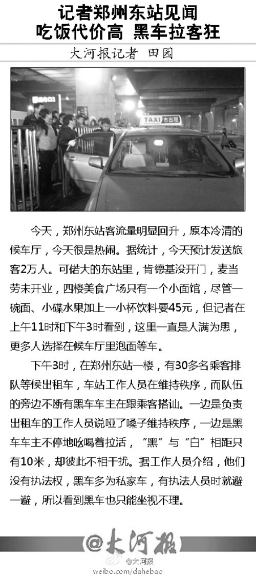 昨天,鄭州東站迎來一次客流小高峰,當(dāng)天,共發(fā)送旅客將近2萬人次。記者來到鄭州東站體驗發(fā)現(xiàn),平素空曠無人的西廣場,出現(xiàn)了很多乘客的身影,三樓候車室也很熱鬧。但與熱鬧場景不相配的是,鄭州東站很多細(xì)節(jié)還未顧及到,吃飯代價高,“黑出租”與“白出租”公然搶生意。