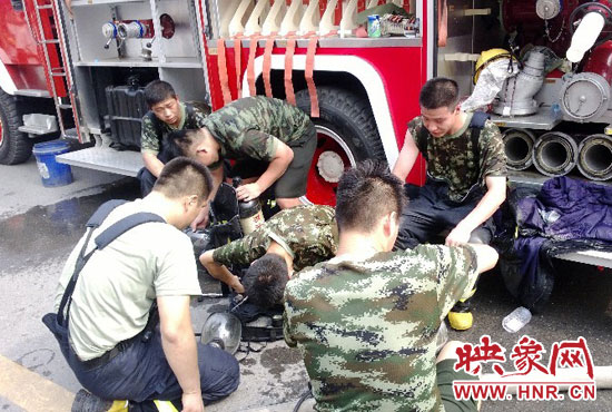 由于天氣炎熱,加上接近火災(zāi)現(xiàn)場(chǎng)、救援時(shí)間長(zhǎng),多名消防戰(zhàn)士虛脫暈倒,現(xiàn)場(chǎng)注射和飲用生理鹽水,附近商戶(hù)也為消防戰(zhàn)士送來(lái)飲用水。
