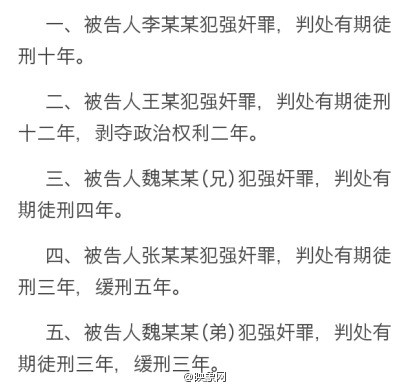 映象網(wǎng)訊 9月26日上午,北京法院網(wǎng)官方微博@京法網(wǎng)事 消息:李某某等5人強奸案一審宣判,其中,被告人李某某犯強奸罪,被判處有期徒刑10年。