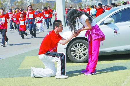 3月27日上午,鄭開國際馬拉松賽五公里小馬拉松比賽在鄭東新區(qū)舉行,情侶方隊、親子方隊等各具特色的參賽隊伍,給緊張的比賽帶來了輕松和快樂。