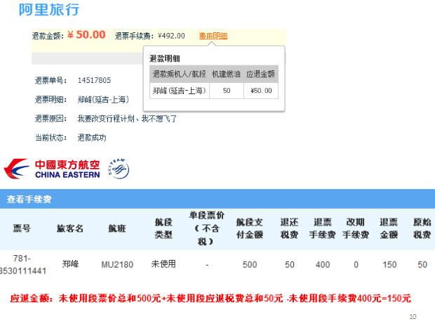 消保委質(zhì)疑:在購票前消費(fèi)者并不知道退改簽規(guī)則,阿里拿著消費(fèi)者的信息在東航退票,東航把錢退給代理商,代理商從中拿了50塊退給了消費(fèi)者,阿里“吃掉”了部分退款手續(xù)費(fèi)?