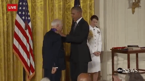 據(jù)報(bào)道,老藝術(shù)家Mel Brooks今天進(jìn)白宮接受“National Medal of Arts”,奧巴馬往他脖子上掛獎(jiǎng)?wù)碌臅r(shí)候,這個(gè)90歲的老頑童做勢要脫奧巴馬的褲子,給總統(tǒng)嚇了一趔趄。