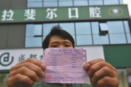 26歲的小姜在成都工作,住在姐姐家。一顆緊靠盡頭牙的左下牙把小姜折磨了近一年,平日他只是弄點(diǎn)含片“對付對付”。10月27日,小姜終于決定“來個(gè)徹底根治”。當(dāng)天下午1點(diǎn)過,他問姐姐要了300塊錢后,來到位于高新區(qū)府城大道的拉斐爾口腔醫(yī)院。