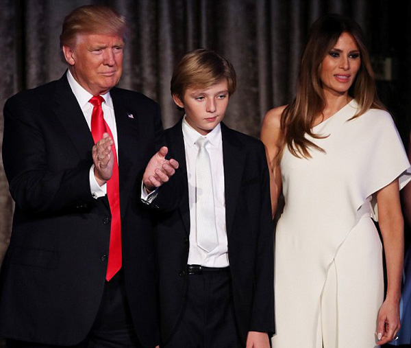 圖中為特朗普(左)、梅拉尼婭(右)和他們的兒子巴倫(中)。特朗普20日確認自己將入住白宮,但被問及梅拉尼婭和巴倫是否和他一起時,他說:“會很快的,等他本學年結(jié)束之后。