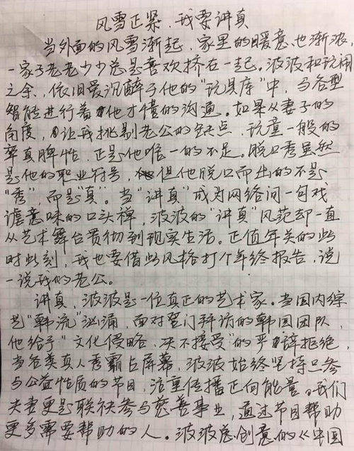 網(wǎng)易娛樂1月26日?qǐng)?bào)道 日前,演員周立波在美國長島因涉嫌持有槍支、藏有毒品而被美國警方逮捕,在繳納保釋金后獲得保釋。此前周立波先是在美國通過媒體表示“持有的槍支合法,毒品并非其所有。之后還曾發(fā)微博自證“事實(shí)和法律將還我清白”。而就在1月26日早上,周立波妻子胡潔通過微博發(fā)布自己的一封手寫信,力贊丈夫周立波“完美”。對(duì)于近日的是非,她更表示“請(qǐng)不要過早下結(jié)論,先操心自己的生活”。