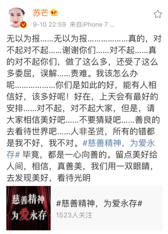 蘇芒微博全文:無以為報,無以為報……真的,對不起對不起,謝謝你們,對不起,真的對不起你們,做了那么多,還受這么多委屈、誤解、責難。我該怎么辦呢……你們是如此的好,能有人相信好,該有多好呢!好在上天會有最好的安排……對不起,對不起大家。但是請大家相信美好吧……不要猜疑吧……善良的去看待世界吧……人非圣賢,所有的錯都是我不好,我不對。畢竟,都是一心向善的。留點美好給人間,相信,真善美,我們用一雙眼睛,去發(fā)現(xiàn)美好,看待光明。