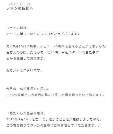 我“安室奈美惠”想借此機(jī)會(huì)告訴我所有的粉絲,我決定于明年2018年9月16日正式隱退。