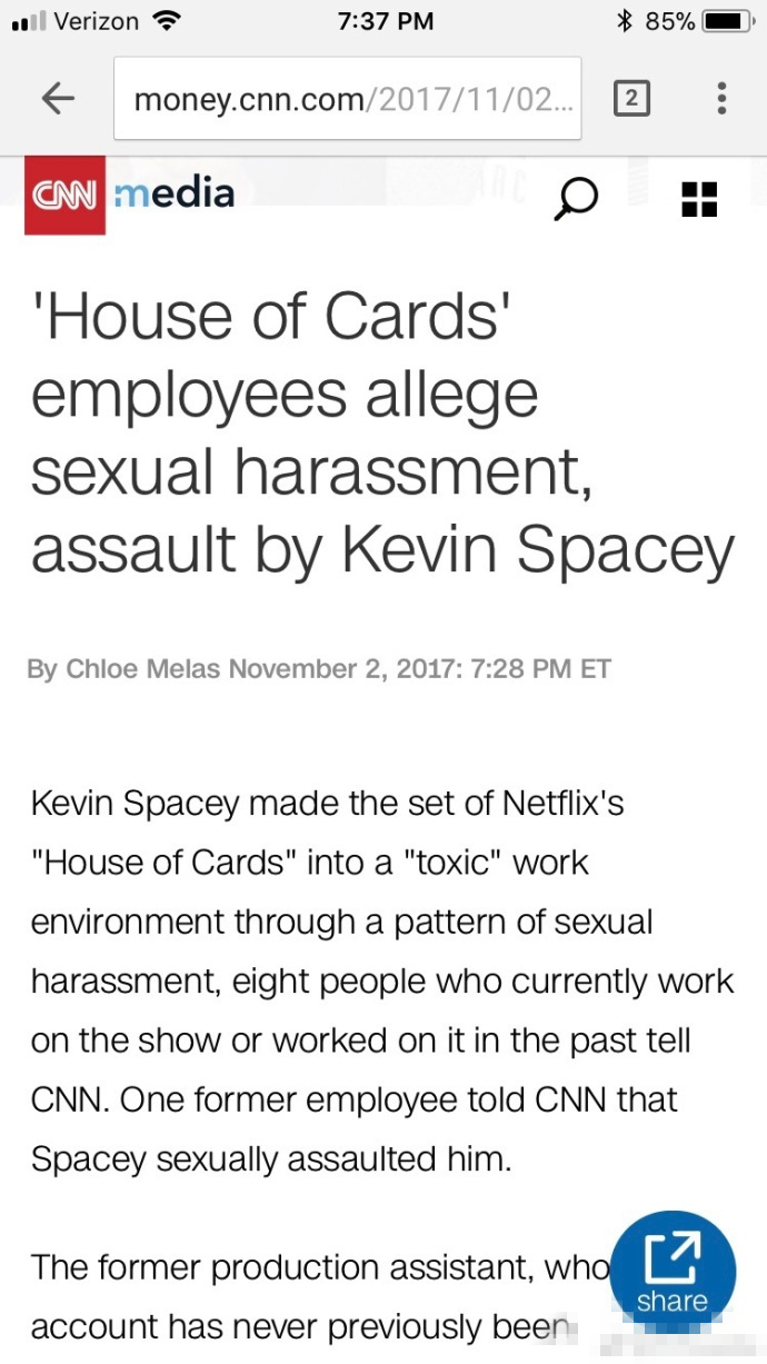 一位曾擔(dān)任過《紙牌屋》制片助理的員工稱,史派西在《紙牌屋》制作前幾季的時(shí)候性侵了他。這名員工說,有一天下午他被安排去開車接史派西來片場(chǎng),結(jié)果在路上的時(shí)候史派西將手伸進(jìn)了他的褲子里?!拔耶?dāng)時(shí)整個(gè)人都驚了,”他說,“史派西在這部劇里的地位是非常高的,而我只是一個(gè)處于最底端的工作人員。”接下來在車?yán)锇l(fā)生的事情,這名員工沒有細(xì)講。等他們到了片場(chǎng)之后,他幫史派西將行李從車上拿到了史派西的保姆車上,當(dāng)時(shí)車上還有兩個(gè)男人,而史派西將他逼到角落不讓他走,然后對(duì)他做了一些不恰當(dāng)?shù)慕佑|。“我告訴他了我不愿意做這些事,我感覺很不舒服。”然后趁著史派西明顯有些慌張的時(shí)候逃離了拖車。