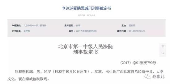1月9日,北京市法院審判信息網(wǎng)公布了李達(dá)球受賄罪減刑刑事裁定書,他被減去有期徒刑7個月。