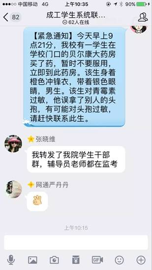 “得知藥房反應的消息后,10時16分09秒,黨委宣傳部迅速與校團委、學生處取得聯(lián)系,希望通過輔導員將信息發(fā)布到全校各個班級群里,展開排查。”學校宣傳部相關(guān)負責人介紹。