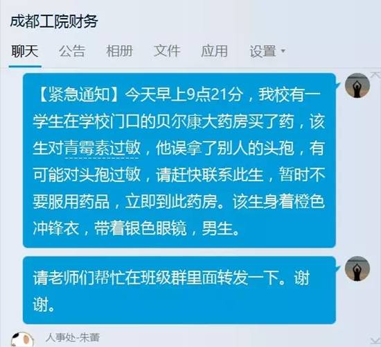 發(fā)布的消息內(nèi)容為:“【緊急通知】今早上9點21分,我校有一學生在學校門口的貝爾康大藥房買了藥,該生對青霉素過敏,他誤拿了別人的頭孢,有可能對頭孢過敏,請趕快聯(lián)系此生,暫時不要服用藥品,立即到此藥房。該生身著橙色沖鋒衣,戴銀色眼鏡,男生?!?/p>