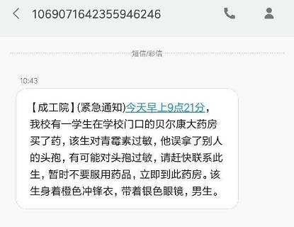 15日上午10時03分,成都工業(yè)學院接到了校門口一藥房的求助:一名戴銀色眼鏡,身著橙色沖鋒衣的學生在結(jié)賬時誤拿了別人頭孢藥,因其告訴工作人員對青霉素過敏,如服用將可能產(chǎn)生嚴重后果。