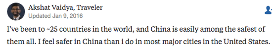 對此,外國網(wǎng)友的回答幾乎都是“當然安全”。甚至有人說:“說句你不愛聽的,在你自己國家獨自旅行可能都比在中國旅行危險。我在中國生活了兩年半,從沒覺得身邊有危險?!?/p>