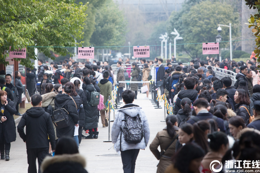 2月24日,浙江傳媒學(xué)院2018年播音與主持藝術(shù)等藝術(shù)類專業(yè)復(fù)試開考。上午8時,播音樓前候考學(xué)生已經(jīng)排起百余米的長隊。今年,考生多為2000年出生的“千禧寶寶”,雖然校方要求素顏面試,但考生們青春滿滿依然養(yǎng)眼吸睛。