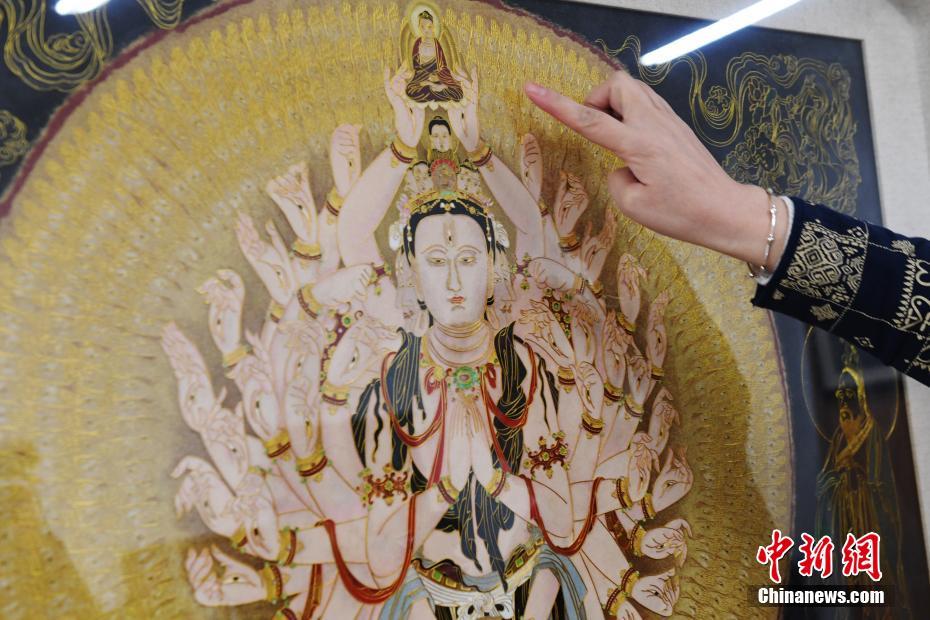 4月7日,蘭州文理學(xué)院女教師白茜介紹自己用萬(wàn)根金屬絲創(chuàng)作出的“千手千眼觀(guān)音”掐絲琺瑯畫(huà)。從小喜歡繪畫(huà)的白茜通過(guò)自己十幾年的摸索,以敦煌壁畫(huà)為范本制作掐絲琺瑯畫(huà)?!扒智а塾^(guān)音”是白茜最滿(mǎn)意的作品,用了萬(wàn)根一米左右的金屬絲臨摹完成。