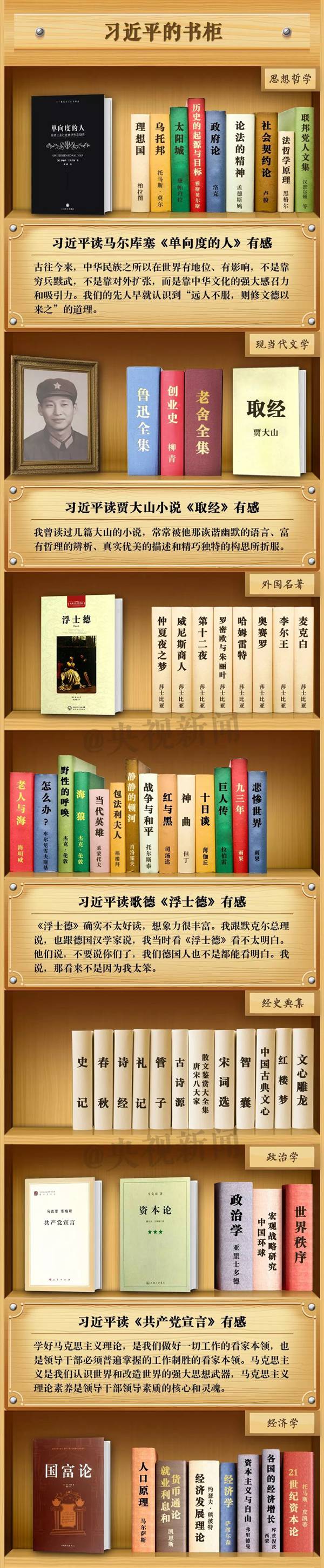 在這個節(jié)日,央視新聞定制了習(xí)近平總書記的“書柜”,來看看總書記的“書單”和讀書感悟吧。