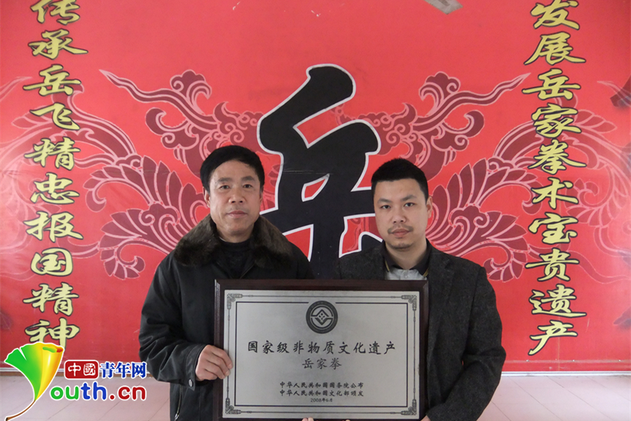2008年,岳家拳正式被國務(wù)院批準為國家級非物質(zhì)文化遺產(chǎn)。張業(yè)金(左)與張奇鋼(右)從北京捧回岳家拳非遺匾。