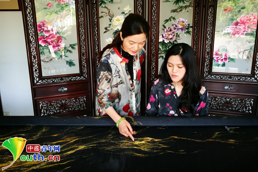 金線用蘇繡典型的平針繡法繡在真絲底料上,明暗金黃色從近處向遠處延伸,燈光照射下,一如夜空中的萬家燈火。若有燈光照射,參觀者會發(fā)現(xiàn)整個底料上還暗藏一幅潑墨山水畫。