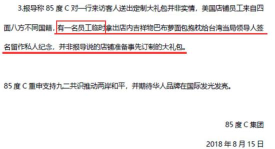 其次,有大陸網(wǎng)友還發(fā)現(xiàn)“85度C”的聲明中有將一切責任推給“臨時工”的嫌疑,并回避了導致這場風波的“源頭”恰恰是跑到美國為臺獨“造勢”的蔡英文。
