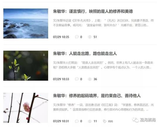 這些文章以游記、散文、人生感悟為主,也有一部分詩歌。其中,最新的一篇為《聞過則喜 折射的是胸襟格局和修養(yǎng)境界》,發(fā)表于8月13日,也就是本周一。