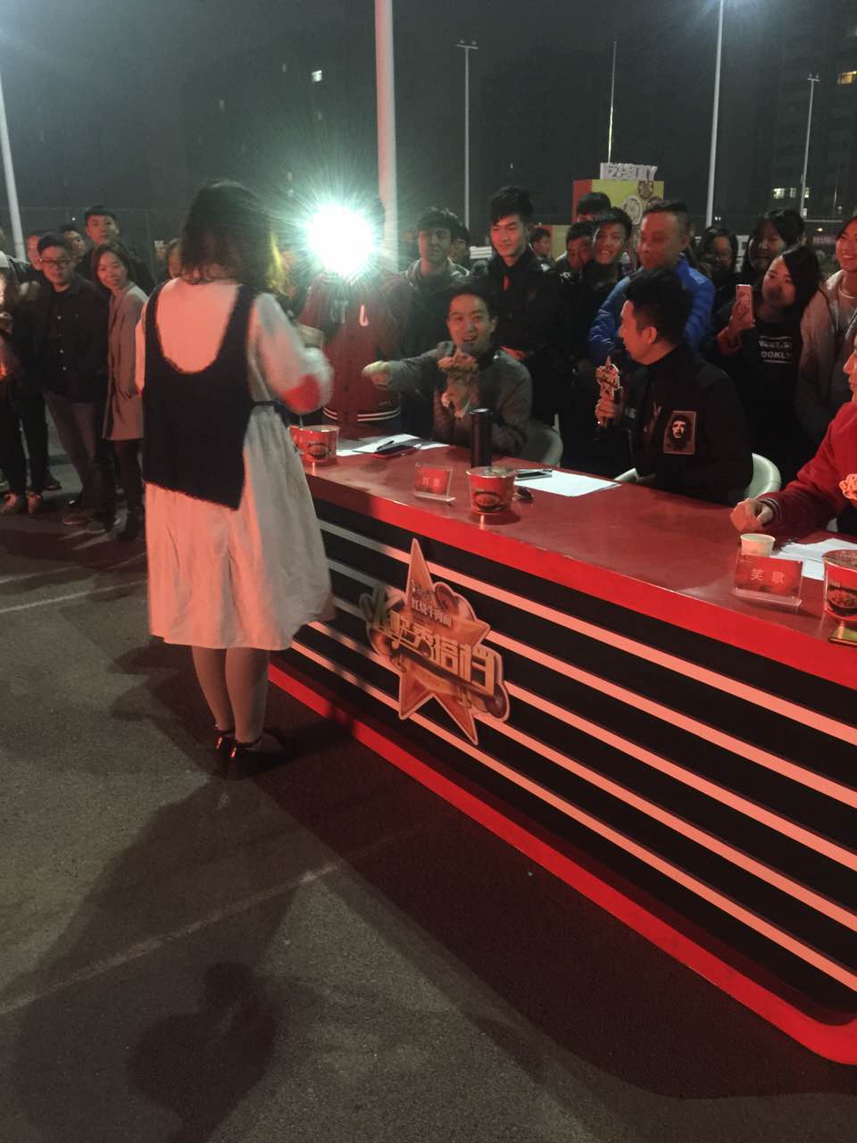 整場海選持續(xù)到天黑,非常有趣的是,可能是大家剛開始都持觀望態(tài)度,臨近天黑的時候,真正的好聲音才開始登上舞臺,比賽的十強幾乎都產(chǎn)生在最后上場的十位選手中,評委現(xiàn)場不僅在盲選,而且在不斷的更新五強的名單,以至于,最后覺得只選五強臺可惜了,在和導演組商議之后,晉級名額直接增加到了十個。他們將和前五場康師傅紅燒牛肉面《名嘴K歌秀》校園海選選拔出來的選手一起,參加《名嘴K歌秀》第三季,獲得和名嘴演唱的機會。