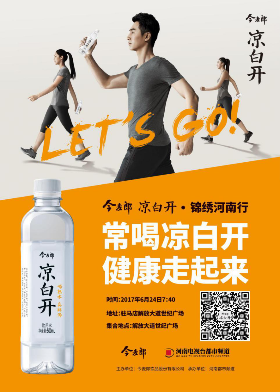 本次活動(dòng)由河南電視臺(tái)都市頻道、今麥郎飲品股份有限公司主辦,計(jì)劃走遍開(kāi)封,許昌,平頂山,洛陽(yáng),鄭州等河南的10座文化名城,“喝熟水 真解渴”6月24,我們?cè)谔斓刂爸小瘪v馬店等你一起“錦繡河南行”。