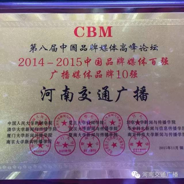 FM1041河南交通廣播榮獲2014-2015中國品牌媒體百強廣播媒體品牌10強。在河南廣播媒體中,僅此一個。這也是對河南交通廣播在節(jié)目、活動、服務(wù)方面成績的肯定。