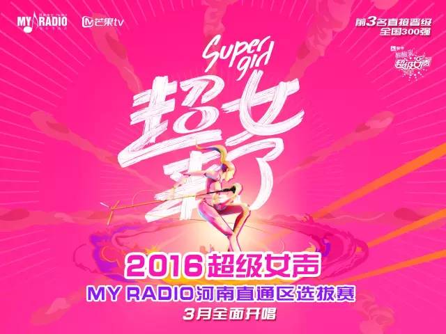 My Radio聯(lián)合芒果TV,2016超級(jí)女聲My Radio河南直通區(qū)選拔賽重磅開啟!河南賽區(qū)冠亞季軍,直接晉級(jí)全國300強(qiáng)。