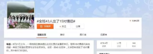 這條消息,最早出現(xiàn)在5月21日的微博和各大網(wǎng)站上,“全班一共43人,大學(xué)四年成就了15對(duì)情侶,畢業(yè)之際在重慶某景區(qū)舉辦集體婚禮?!本W(wǎng)友直呼:這簡直不可思議。