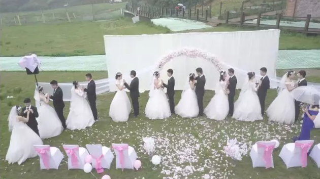 青山環(huán)抱的草坪中間,鮮花點(diǎn)綴,西服、婚紗、司儀……一樣不少,成對(duì)的新郎新娘溫情相擁,環(huán)繞的云霧和綿綿細(xì)雨,更為這場(chǎng)婚禮營造了浪漫的氣氛。據(jù)網(wǎng)上文章稱,婚禮現(xiàn)場(chǎng)的新郎、新娘們,是來自成都一高校工程造價(jià)管理專業(yè)大四一畢業(yè)班的15對(duì)情侶。