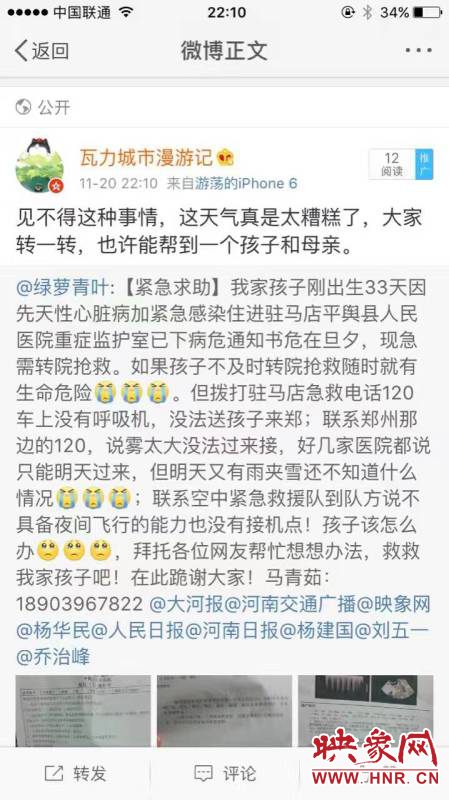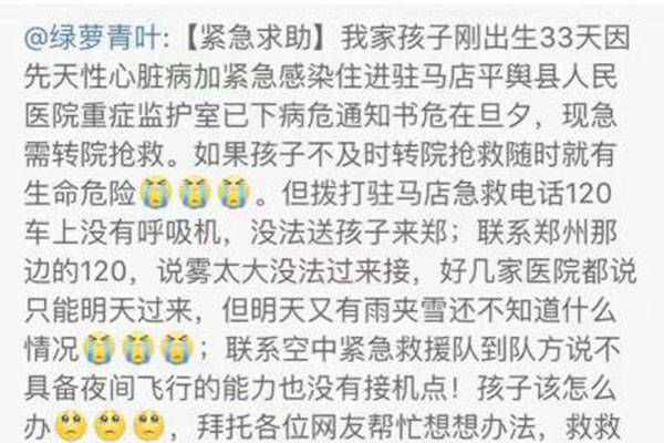 11月20日晚,一條微博牽動著無數(shù)人的心。駐馬店平輿縣一個剛剛出生33天的嬰兒因先天性心臟病加緊急感染被駐馬店市平輿縣人民醫(yī)院下達(dá)了病危通知書,但當(dāng)?shù)蒯t(yī)療條件有限,患兒無法得到及時有效的治療,急需轉(zhuǎn)院治療,但聯(lián)系的鄭州醫(yī)院因為天氣原因無法前往。